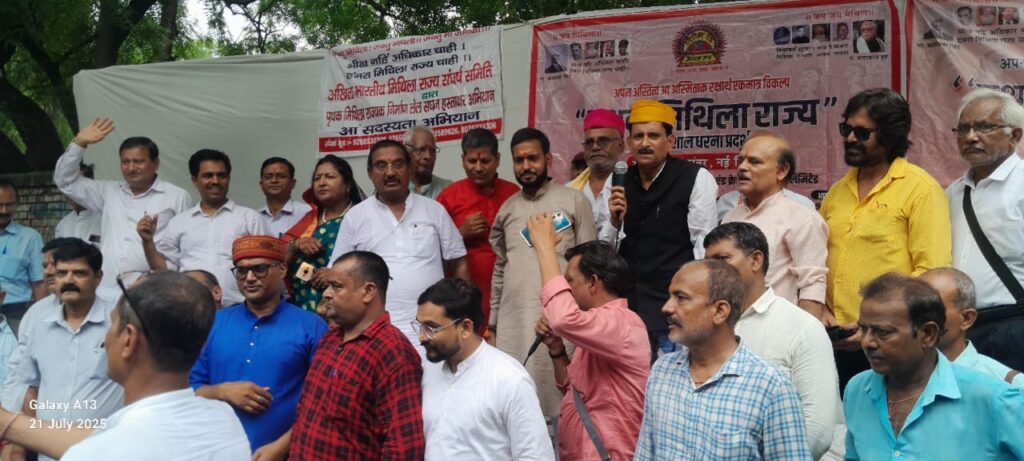 दिल्ली : अखिल भारतीय मिथिला राज्य संघर्ष समिति के तत्वावधान में सोमवार को राष्ट्रीय राजधानी के जंतर मंतर पर धरना प्रदर्शन किया गया. इसमें हजारों की संख्या में मिथिला वासी एवं प्रवासी मैथिलों ने अपनी सक्रिय भिगीदारी दी. प्रदर्शन का नेतृत्व अंतर्राष्ट्रीय संयोजक प्रो अमरेंद्र कुमार झा ने किया. बाद में धरना की अध्यक्षता पं० सुनहरी लाल झा और संचालन राष्ट्रीय प्रवक्ता एवं मीडिया प्रभारी ईं. शिशिर कुमार झा ने की. दूरभाष पर अपने आनलाइन सम्बोधन में समिति के राष्ट्रीय अध्यक्ष डॉ बैद्यनाथ चौधरी बैजू ने कहा कि सनातनी मिथिला को राज्य की मांग करते हुए सौ बरस से ऊपर हो गया. इस भौगोलिक क्षेत्र में बंगाल से बिहार, उड़ीसा और झारखंड राज्य बन गया. मिथिला क्षेत्र लगातार बिहार से अलग होने की मांग कर रहा है। राष्ट्रीय प्रवक्ता एवं मीडिया प्रभारी ईं. शिशिर कुमार झा ने कहा कि मैथिलों के लिए बिहारी शब्द मिथिला के नैतिक पहचान ,नैतिक मूल्य ,सभ्यता -संस्कृति, भाषा एवं विकास में बाधक है. बिहार में मैथिलों की पहचान लुप्त होती जा रही है। अंजनी कुमार एवं अशोक झा ने एक स्वर में कहा कि सरकारी उपेक्षा के कारण दरभंगा में उच्च न्यायालय की बेंच वर्षो से अधर में लटका हुआ है। मैथिल के मान-सम्मान एवं पहचान के लिये मिथिला राज्य जरूरी है। प्रो० अमरेंद्र कुमार झा ने चेतावनी दी कि यदि यथाशीघ्र मिथिला राज्य का गठन नही किया गया तो बिहार से दिल्ली तक जोरदार आंदोलन किया जायेगा। आगामी बिहार विधान सभा चुनाव को देखते हुये उन्होंने सभी विधायक और सांसद से मिथिला-मैथिली के लिये अपने प्रयासों से किये गये संघर्ष का ब्यौरा मांगा.
