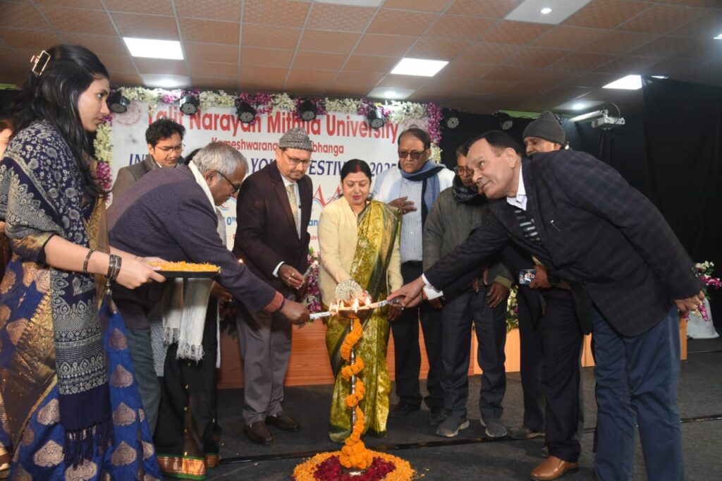 दरभंगा : ललित नारायण मिथिला विश्वविद्यालय, दरभंगा के कुलपति प्रोफेसर संजय कुमार चौधरी की अध्यक्षता में 10 से 13 जनवरी के बीच विश्वविद्यालय के पीजी एथलेटिक्स एवं डॉ एपीजे अब्दुल कलाम डब्ल्यूआईटी के संयुक्त तत्त्वावधान में चार दिवसीय इंटर कॉलेज यूथ फेस्टिवल प्रतियोगिता 2025-26 “अनन्तनाद” का उद्घाटन समारोह विश्वविद्यालय परिसर स्थित जुबिली हॉल में आयोजित किया गया, जिसमें मुख्य अतिथि के रूप में राज्यसभा सांसद डॉ धर्मशिला गुप्ता, वित्तीय सलाहकार इन्द्र कुमार, संकायाध्यक्ष- प्रो एच के सिंह, प्रो मंजू राय, प्रो लावण्य कीर्ति सिंह ‘काव्या’, प्रो शशि भूषण राय, दिल्ली से पधारे जूरी के सदस्य देवेन्द्र वर्मा, डीएसडब्ल्यू प्रो अशोक कुमार मेहता, डब्ल्यूआईटी निदेशक सह आयोजन समिति के अध्यक्ष प्रो अजय नाथ झा, खेल पदाधिकारी डॉ अमृत कुमार झा तथा पीजी एथलेटिक्स के अध्यक्ष सह आयोजन सचिव डॉ प्रियंका राय, विभागाध्यक्ष, प्रधानाचार्य, शिक्षक, पदाधिकारी, कर्मचारी, स्वयंसेवक, विभिन्न कॉलेजों के टोली प्रबंधक तथा प्रतिभागी छात्र-छात्राओं सहित 150 से अधिक व्यक्ति उपस्थित थे।