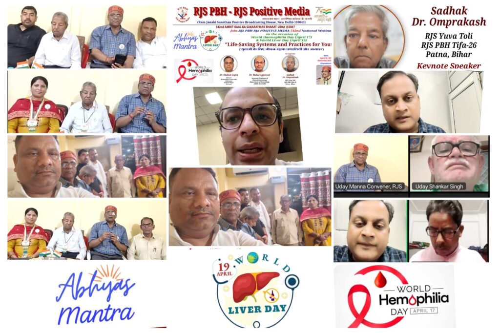 Citizen Awaz Darbhanga : आधुनिक चिकित्सा विज्ञान, पारंपरिक आयुर्वेदिक अभ्यास और आध्यात्मिक माइंडफुलनेस के एक व्यापक संगम में, राम जानकी संस्थान पॉजिटिव ब्रॉडकास्टिंग हाउस, जिसे व्यापक रूप से आरजेएस पीबीएच के रूप में जाना जाता है, ने अपना 542वां वैश्विक वेबिनार आयोजित किया। विश्व हीमोफीलिया दिवस(17अप्रैल), आगामी विश्व लिवर दिवस (19अप्रैल)के अवसर पर आयोजित यह कार्यक्रम जीवन रक्षक स्वास्थ्य प्रोटोकॉल के प्रसार के लिए एक महत्वपूर्ण मंच के रूप में कार्य करता है। राष्ट्रीय संयोजक उदय कुमार मन्ना ने इस सत्र का नेतृत्व किया, जिसका पटना में साधक डॉ. ओमप्रकाश जी द्वारा 18 अप्रैल 2026 को आयोजित एक भौतिक सभा से एक साथ प्रसारण किया गया, जो संगठन की जमीनी स्तर से वैश्विक पहुंच को दर्शाता है।