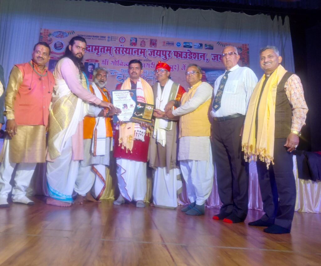 Patna : वेदामृतम् संस्थानम् जयपुर फाउंडेशन द्वारा आयोजित “वेदामृतम् ज्योतिष–वास्तु एवं आयुर्वेद शिखर सम्मेलन–2026” में बिहार के प्रख्यात वैदिक ज्योतिषाचार्य एवं शोधकर्ता डॉ. राघव नाथ झा ने “कृषि, वर्षा और वैदिक ज्योतिष : शास्त्र तथा आधुनिक विज्ञान का समन्वित प्रतिमान” विषय पर अत्यंत सारगर्भित, शोधपरक एवं विचारोत्तेजक व्याख्यान प्रस्तुत किया। उनके विशिष्ट शास्त्रीय एवं अनुसंधानात्मक योगदान के लिए संस्था की ओर से उन्हें सम्मान-पत्र प्रदान कर अलंकृत किया गया।
