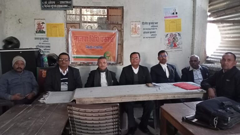 दरभंगा : दिनांक 08.02.2024 को दरभंगा बार एसोसिएशन के नयी लाईब्रेरी के सम्मुख भाजपा विधि प्रकोष्ठ दरभंगा की बैठक हुई जिसमें भाजपा विधि प्रकोष्ठ दरभंगा से सम्बद्ध अधिवक्ता बन्धुओं के द्वारा नवमनोनीत जिला संयोजक अधिवक्ता विष्णु कांत चौधरी उर्फ सुमन जी को हार्दिक बधाई एवं शुभकामनाएं दी गयी।