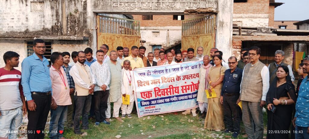 दरभंगा : विश्व जल दिवस के अवसर पर भारत-नेपाल कमला मैत्री मंच, दरभंगा द्वारा ‘जल संकट एक गंभीर समस्या एवं समाधान’ विषय पर एक संगोष्ठी का आयोजन दरभंगा जिला खादी ग्रामोद्योग संघ, लहेरियासराय में भगवती झा की अध्यक्षता में आयोजन की गयी | कार्यक्रम की जानकारी देते हुए अजित कुमार मिश्र ने कहा की वर्ल्ड रिसोर्सेज इंस्टिट्यूट (डब्ल्यूआरआई) द्वारा जारी रिपोर्ट के अनुसार भारत सहित दुनिया के 25 देशों में जल संकट गंभीर रूप ले चुका है । मिथिला में जल-संकट कई तरह से है, जैसे बाढ़, जल जमाव, सुखाड़, आर्सेनिक और प्रदूषित जल की समस्या के साथ-साथ अब पेय जल संकट भी विकराल रूप से बढ़ रहा है |