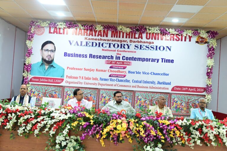 दरभंगा: समापन सत्र का आयोजन विश्वविद्यालय परिसर स्थित जुबली हॉल में हुआ। इस सत्र के मुख्य अतिथि झारखंड केन्द्रीय विश्वविद्यालय, रांची के पूर्ण कुलपति प्रोफेसर एन. के. यादव इंदु थे एवं आशीर्वादात्मक वक्ता वाणिज्य एवं व्यवसाय प्रशासन विभाग के पूर्व विभागाध्यक्ष सह निदेशक प्रो. बी. बी. इल. दास थे। सत्र की अध्यक्षता कुलपति प्रोफेसर एस. के. चौधरी ने की।