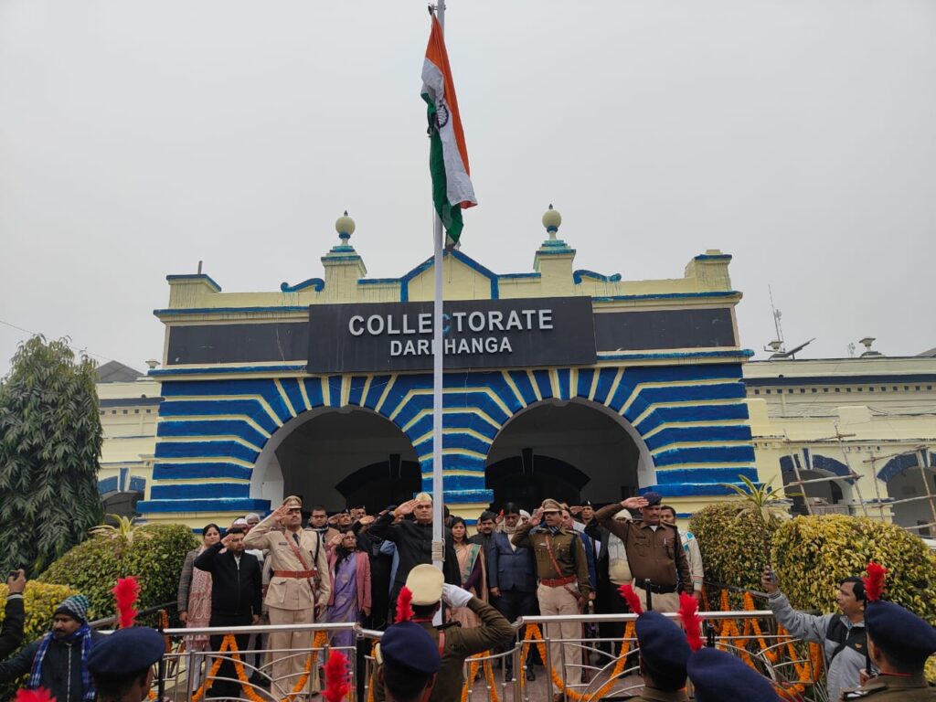 दरभंगा : 75 वें गणतंत्र दिवस के अवसर पर दरभंगा समाहरणालय में जिलाधिकारी राजीव रौशन द्वारा पूर्वाह्न 10:25 बजे झंडोत्तोलन किया गया।