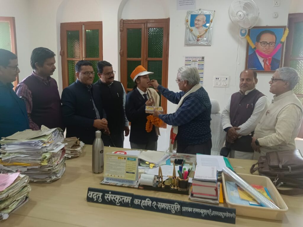 दरभंगा : म.अ.र. लता संस्कृत महाविद्यालय की स्वयंसेविका नेहा सिंह को कामेश्वर सिंह दरभंगा संस्कृत विश्वविद्यालय के कुलपति प्रो0 एलएन पांडेय ने शुक्रवार को अपने कार्यालयीय कक्ष में पाग व चादर से सम्मानित किया तथा उसे मिठाइयां भी खिलाई। मौके पर कुलपति ने कहा कि नेहा ने विश्वविद्यालय का मान बढ़ाने का काम किया है। अन्य छात्रों को भी इस ओर सजग होने की जरूरत है। उन्होंने
