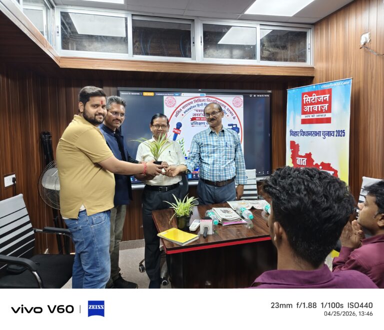 दरभंगा : ललित नारायण मिथिला विश्वविद्यालय के स्नातकोत्तर हिन्दी विभाग द्वारा संचालित “पत्रकारिता एवं जनसंचार कोर्स” के 2025-26 सत्र के छात्र-छात्राओं के लिए 15 दिवसीय प्रशिक्षण शिविर का उद्घाटन सिटीजन आवाज कार्यालय, लहेरियासराय में किया गया। विश्वविद्यालय हिन्दी विभाग के अध्यक्ष प्रो उमेश कुमार की अध्यक्षता में आयोजित उद्घाटन सत्र में मुख्य अतिथि के रूप में विश्वविद्यालय के पीआरओ एवं सीएम कॉलेज में पत्रकारिता कोर्स के पूर्व समन्वयक डॉ आर एन चौरसिया, मुख्य प्रशिक्षक पंकज कुमार झा, ललन कुमार झा एवं प्रशिक्षक आशीष रंजन, धनराज कुमार, सियाराम मुखिया, प्रणव कुमार मिश्रा, विक्रम कुमार, धनंजय कुमार, अंकित कुमार, नीरज कुमार, अक्षय कुमार झा, सिकंदर कुमार महतो, धीरज कुमार, गुड्डू कुमार आदि उपस्थित थे। सिटीजन आवाज मुख्य संपादक पंकज कुमार झा ने अतिथियों का स्वागत पौर्ट-पौधों से किया ।